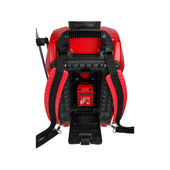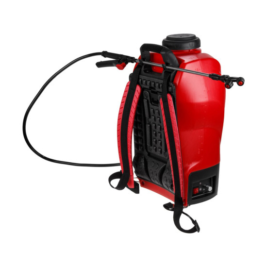 Аккумуляторный садовый опрыскиватель оборудован 16-литровым баком для жидкости, функционирует от литий-ионной батареи. Давление создается одним нажатием кнопки. Имеет регулировку подачи жидкости. Благодаря широкой горловине основной бак легко заполнить. Ранцевый эргономичный ремень с мягкой подушкой и удобная ручка для переноски обеспечивают комфортное перемещение во время работы. Удочку можно хранить сверху и сбоку, для этого предусмотрены надёжные держатели.