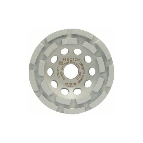 Технические характеристики Тип чашки алмазная Диаметр чашки 125 мм Высота сегмента 4,5 мм Количество сегментов 18 шт Тип алмазной чашки Двурядная Назначение чашкидля быстрого шлифования толстых слоев бетона и штукатурки Максимальное число оборотов 12250 обмин Максимальная скорость вращения 80 мс Максимальный дисбаланс 50 гмм Упаковка картон Посадочный размер 22,2 мм Обрабатываемый материал Бетон