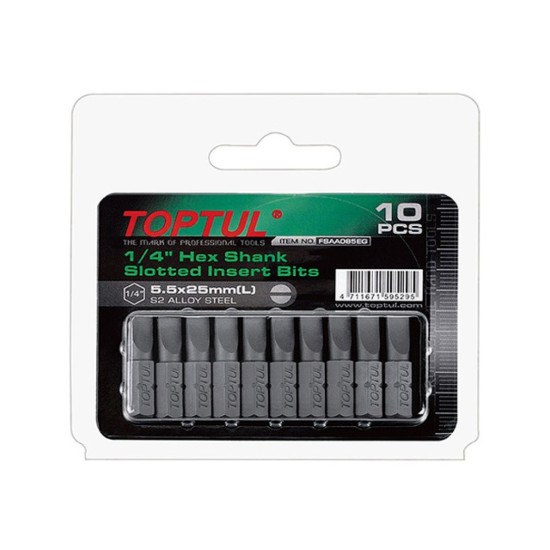 Бита SL3х0,5x25 мм 10 штук TOPTUL (FSAA0803G) используется в качестве сменной насадки при работе с крепежом, имеющим плоский шлиц. Изготовлены из стали S2. Покрытие - цинковое фосфатирование. Присоединительный размер 14: есть